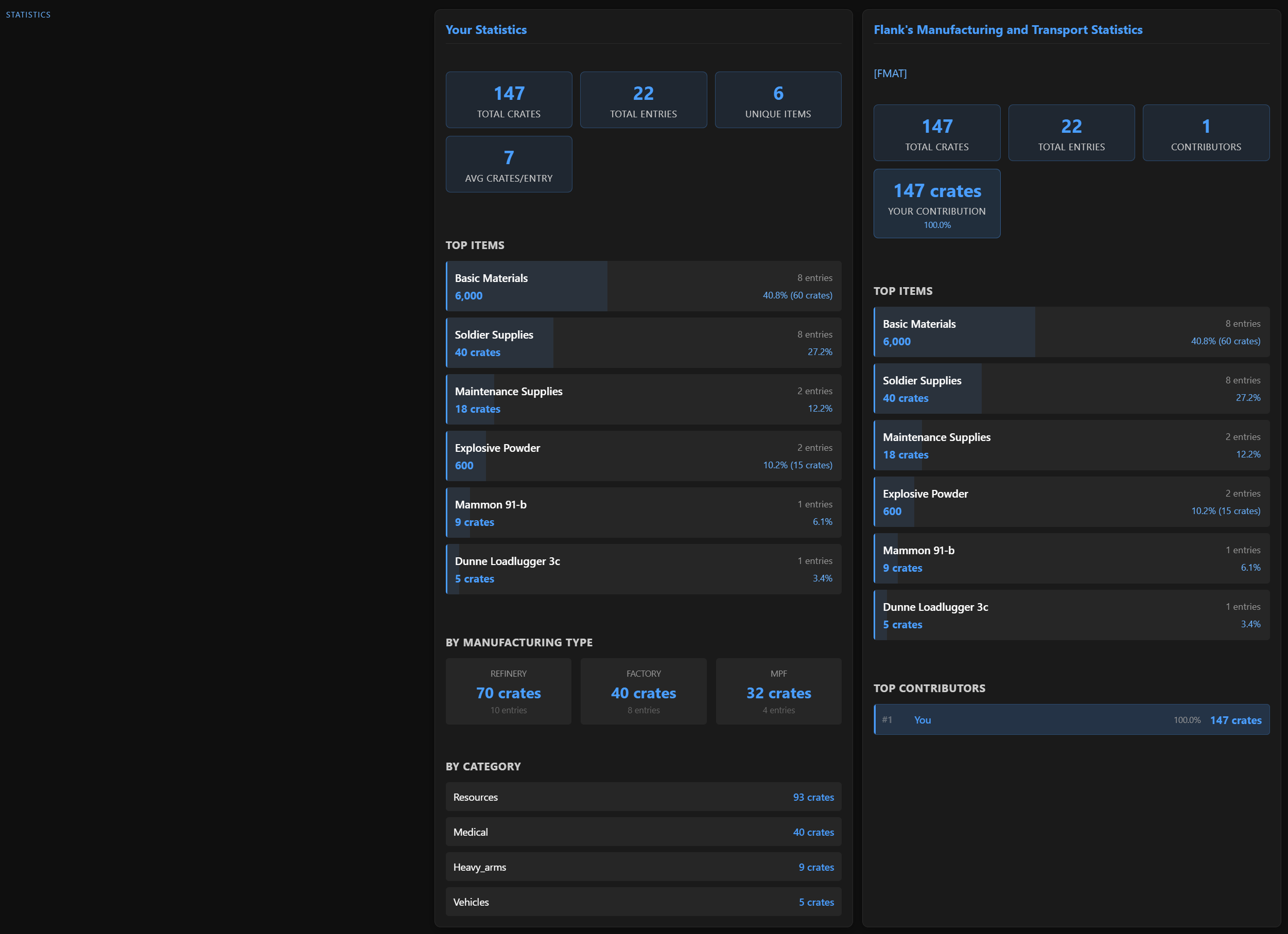 See how much of each type of material your regiment is producing, what might be missing, and who the top contributors are.